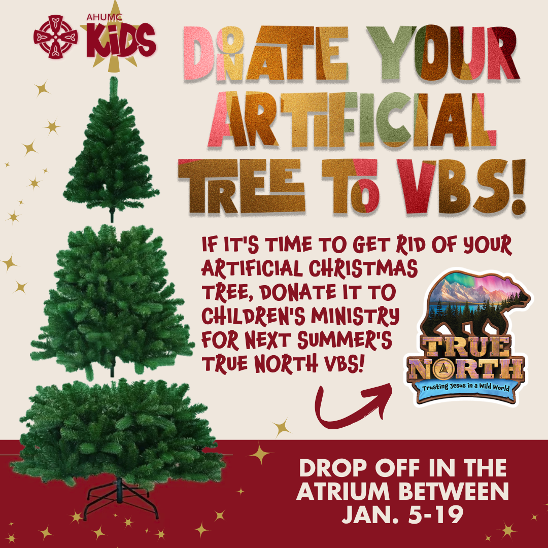 If it's time to get rid of your artificial Christmas tree, donate it to AHUMC for our 2025 True North VBS.