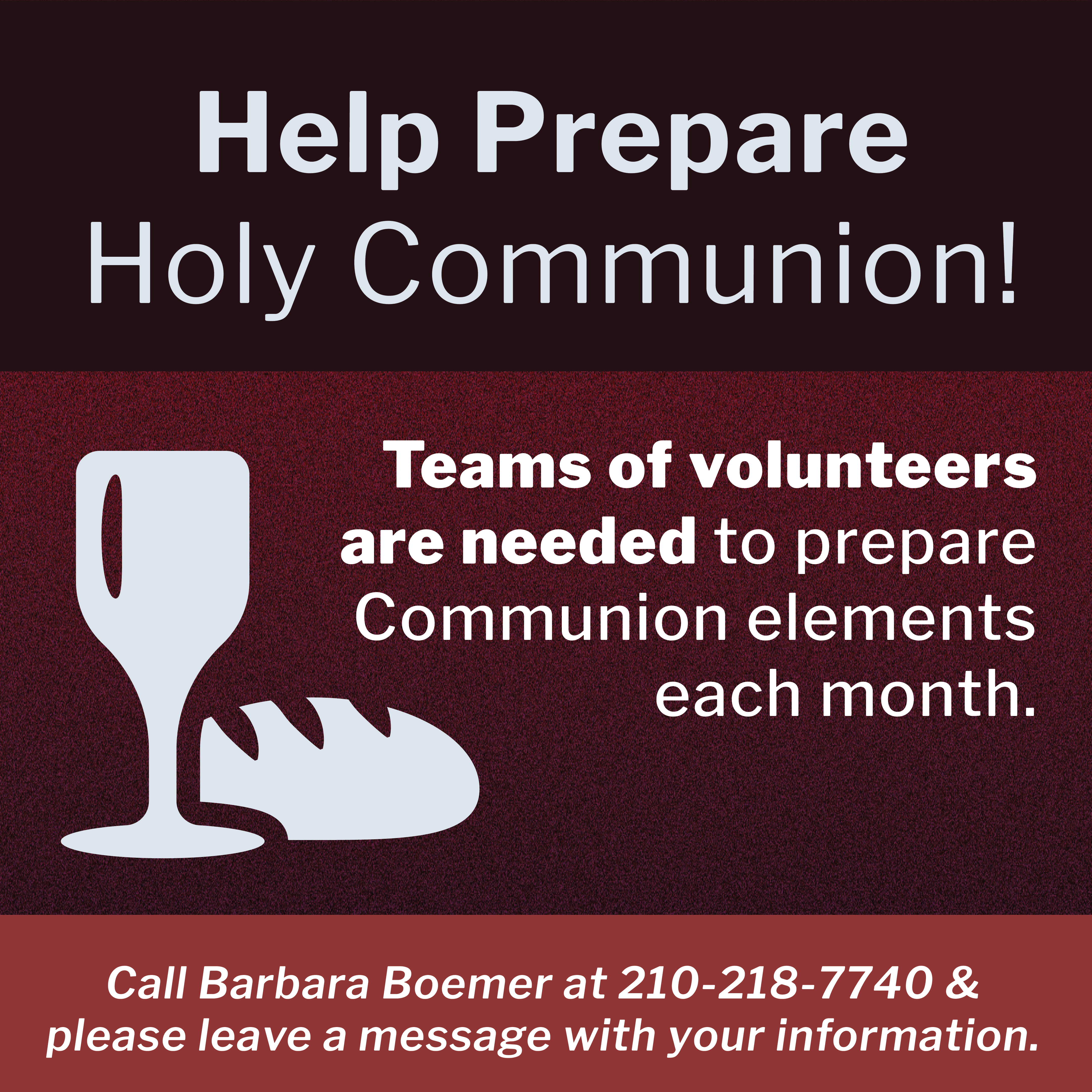 Volunteers Needed for Communion Sundays 06/30/2022 Twelve volunteers are needed for the preparation and clean-up of Communion Sundays. READ MORE