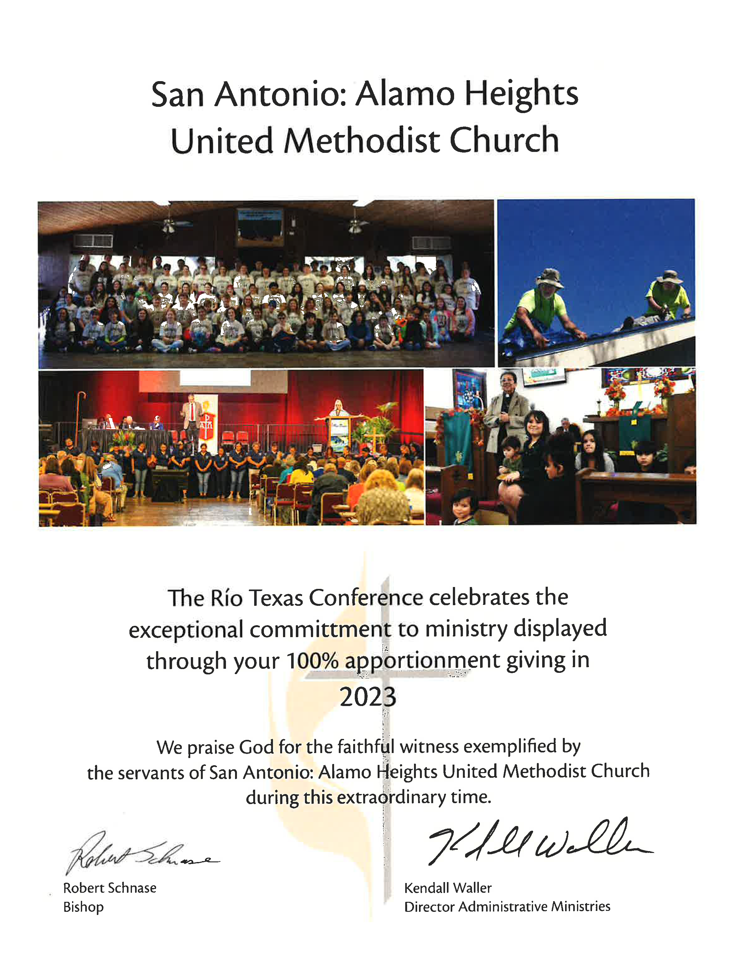 The Rio Texas Conference celebrates the exceptional committment to ministry displayed through your 100% apportionment giving in 2023.