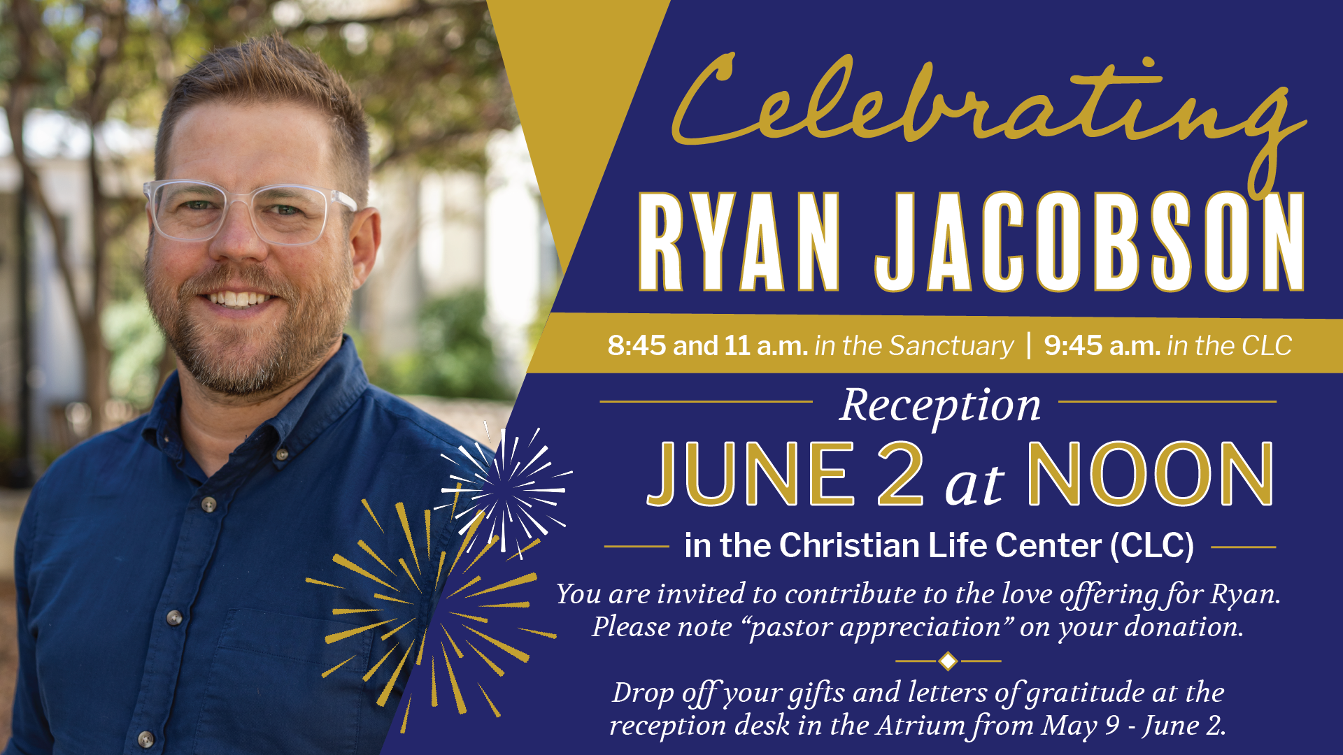 June 2 will be Pastor Ryan Jacobson's last Sunday at AHUMC. To celebrate his time served with us, the church will host a reception for him after the 11 a.m. service on that day, and all are invited!