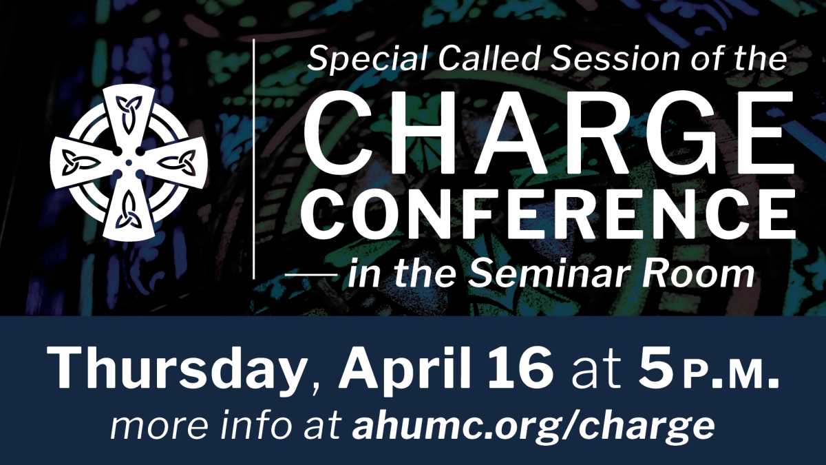 Members of AHUMC are invited to a special called session of the Church Conference onThursday, April 16 at 5 p.m. in the Seminar Room (W100-101).At this Charge Conference, we will consider and vote on two candidates for ordained ministry.