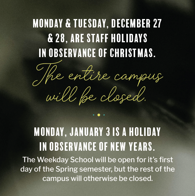 Monday, January 3 is a holiday in observance of New Years. The Weekday School will be open for it’s first day of the Spring semester, but the rest of the campus will otherwise be closed.