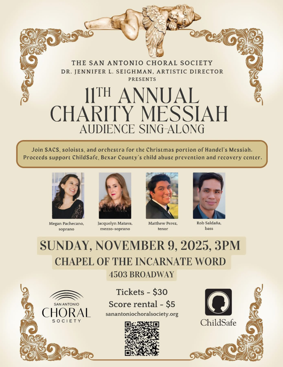 This Sunday, November 9th at 3 p.m., the San Antonio Choral Society will host the 11th Annual Charity Messiah Concert in the Chapel of The Incarnate Word.