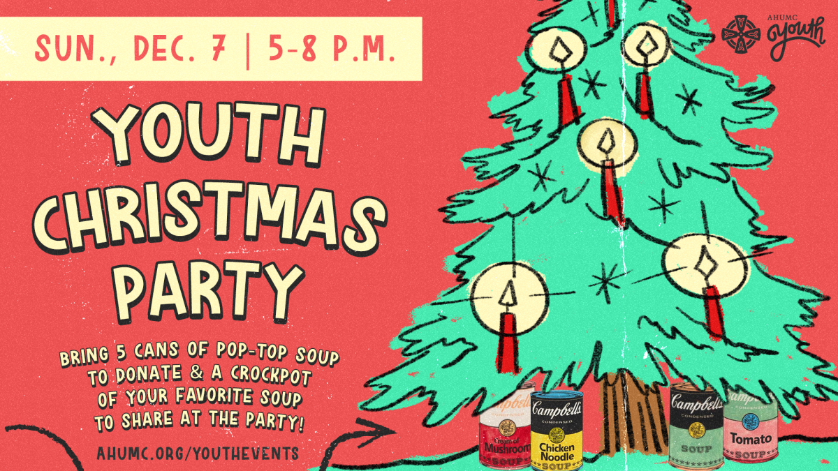 AHUMC Youth will celebrate together in the Youth Wing on December 7 at 5 p.m. Bring 5 cans of pop-top soup to donate and a crockpot of your favorite soup to share!