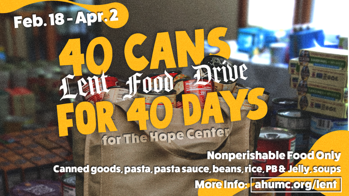We would like to invite you to partner with us in one of AHUMC's Lenten practices. As you go through 40 days of preparation, we’d hope you will join us in prayer for the Hope Center. We also ask that you will consider donating a can of food for each of the 40 days of Lent.